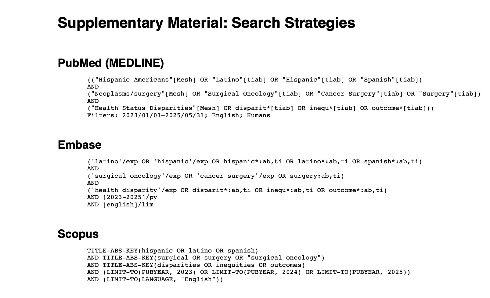 A structured search of PubMed, Embase, and Scopus was conducted to identify studies published between January 1, 2023, and May 31, 2025, that examined disparities in surgical oncology among LHS+ populations. The search combined controlled vocabulary and free-text terms for LHS+ groups, surgical oncology, and disparities, and was restricted to publications in English. Inclusion criteria were peer-reviewed original studies (RCTs, cohort, case–control, cross-sectional, registry/database, or systematic reviews) reporting surgical or oncologic outcomes among LHS+ patients, including subgroup analyses. Exclusion criteria were nonoriginal articles, animal or laboratory studies, studies without disaggregated outcomes for LHS+ populations, and conference abstracts or gray literature. After removing duplicates, titles and abstracts were screened, followed by full-text review, with eligible studies incorporated into the synthesis. The study selection process is summarized in Figure 1. The complete search strategies for PubMed, Embase, and Scopus are provided in Appendix 1.
